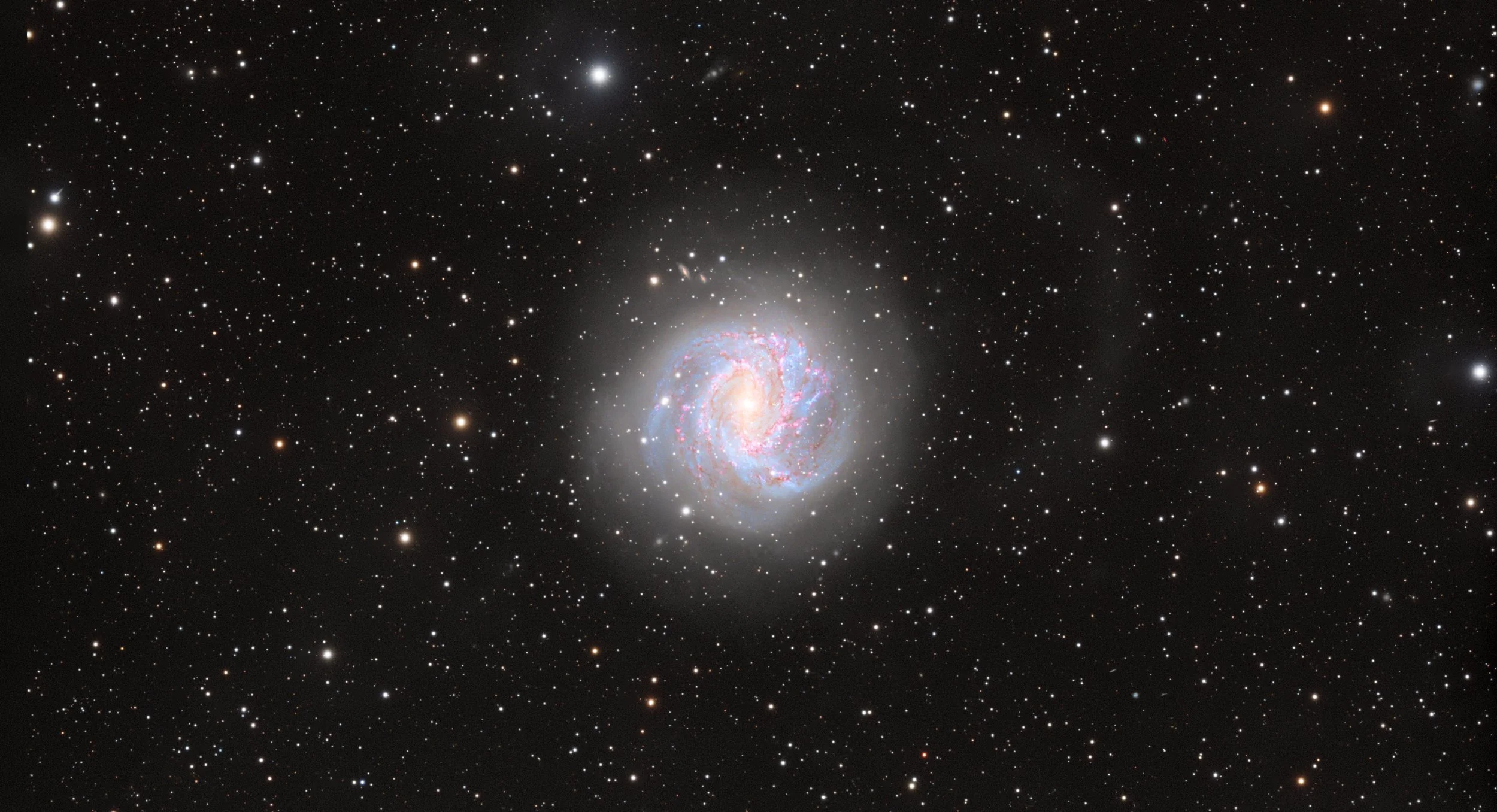 Spiral galaxies are one of the most beautiful and well-studied structures. These galaxy types, which include galaxies like our own Milky Way, were classified as part of the Hubble sequence by Edwin Hubble. At the cores of these galaxy types lies a dense bulge composed mostly of older stars, often surrounding a supermassive black hole. At the same time, the surrounding disk contains gas, dust and younger stellar populations. The most defining feature - being the spiral arms - are not a fixed structure but rather regions of higher density known as density waves, where gas is compressed as it orbits the galaxy, triggering intense star formation. This is why spiral arms appear bright and blue—dotted with glowing hydrogen regions and clusters of young stars. In the above image of Messier 83, hydrogen has been imaged separately to try to bring a pop of red.