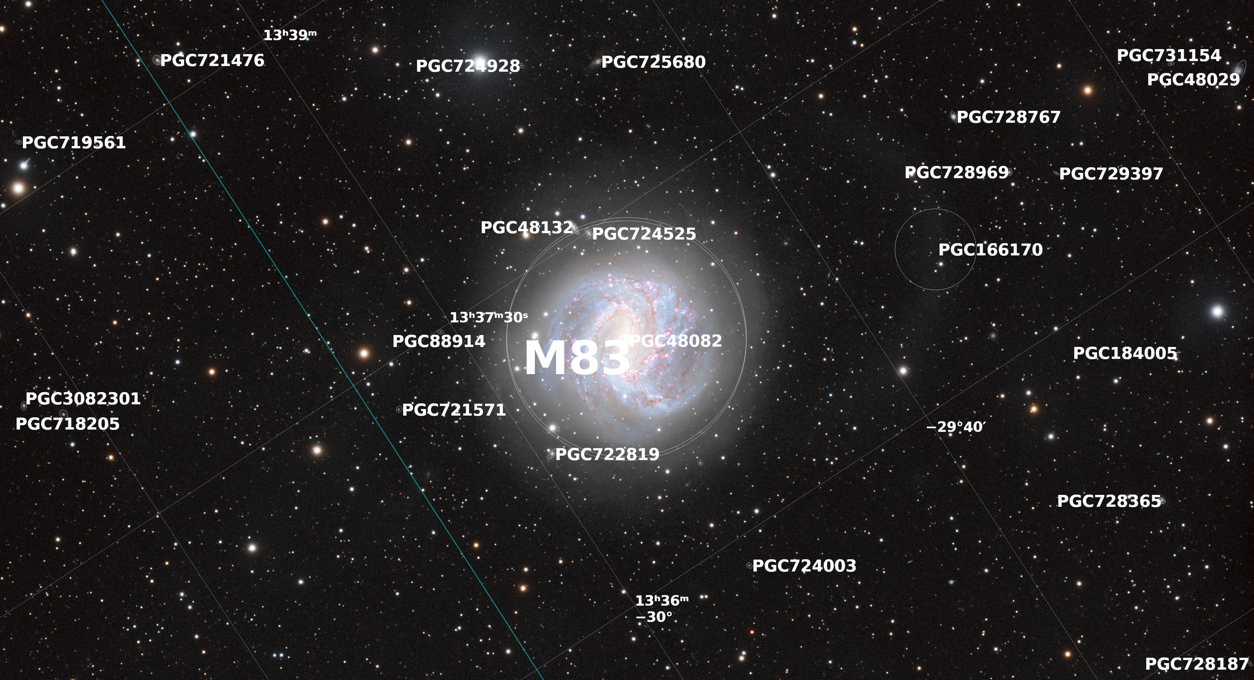 This image contains several background galaxies, all labelled as PGC and then a corresponding number. There are approximately 21 galaxies labelled in this image. PGC stands for Principal Galaxies Catalogue, a large catalogue of galaxies that was compiled in 1989.